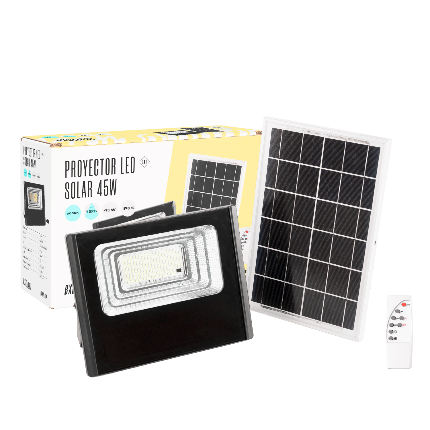 Holofote LED solar 45W 6500K Painel: 6V/6W Bateria: 3,2V/3000MaH Controle remoto [BX3-SOLARFL-45W-01]